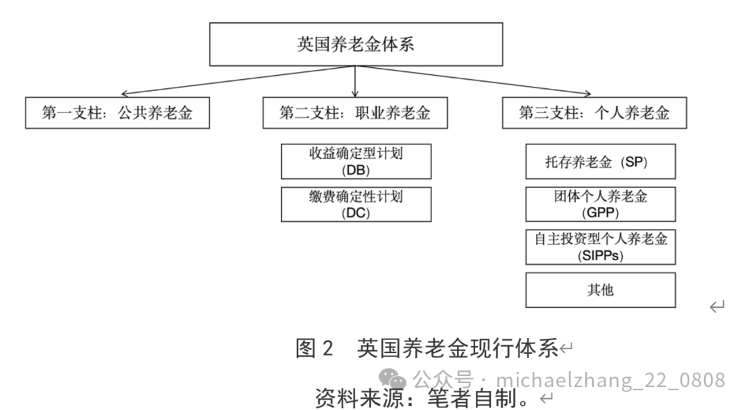 按照世界银行建议的三支柱方案,当前的英国养老金体系可大致分为公共养老金、职业养老金和个人养老金(见图2)。