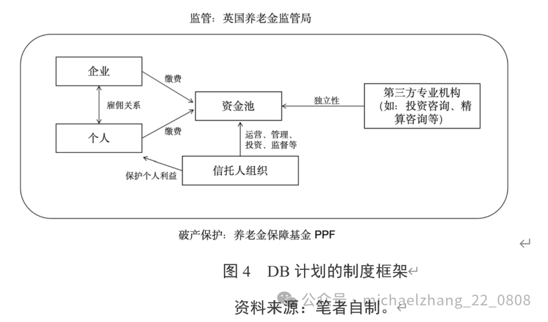 DB计划是一种由企业出资且管理独立于企业的信托基金。企业既可以委派信托人负责组织和监督DB计划的日常管理运营,也可以与监管机构授权的第三方专业机构合作,信托人的具体任务包括但不限于制定缴费计划、评估养老金的资产负债比、满足监管要求以及在资产负债比不满足法定目标时制定恢复计划等。此外,监管要求DB计划必须聘请独立且专业的投资咨询机构,帮助制定养老金的投资方案(见图4)。