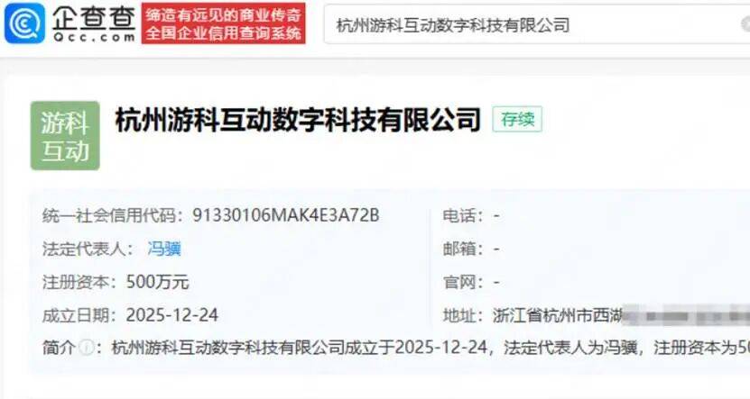 企查查APP显示,12月24日,杭州游科互动数字科技有限公司成立,法定代表人为冯骥,经营范围涉及互联网游戏服务、出版物批发、出版物零售、动漫游戏开发等。企查查股权穿透显示,该公司由杭州游科互动科技有限公司全资持股。