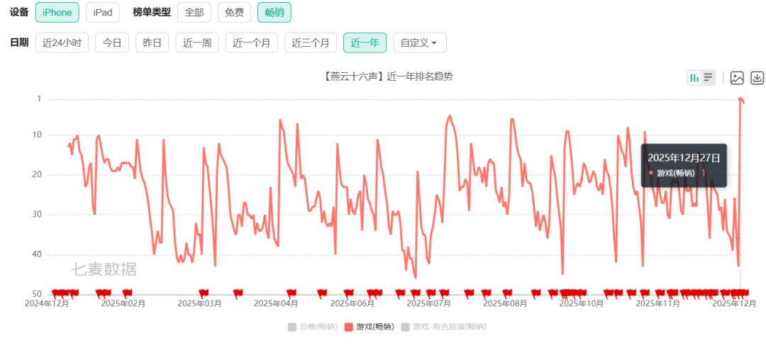 12月27日,网易《燕云十六声》在开启周年庆版本后首次登顶iOS国区游戏畅销总榜,刷新此前第5名的纪录。此外,《燕云十六声》出海成绩瞩目,其国际服自11月15日上线以来已吸引超1500万玩家。