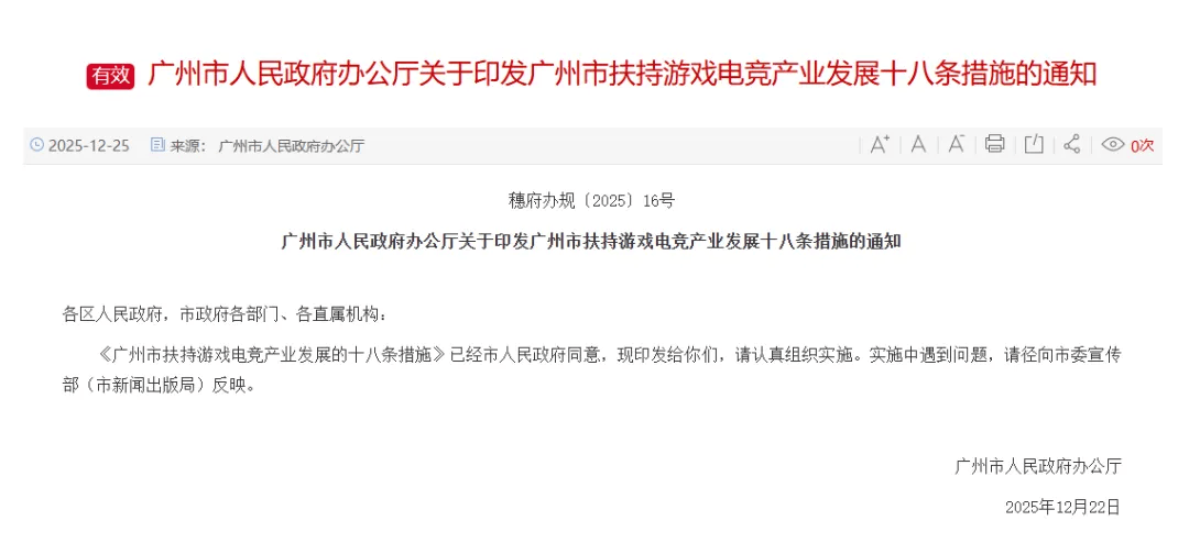 12月25日,广州市政府发布《广州市扶持游戏电竞产业发展的十八条措施》,设立专项扶持经费,单个企业年度最高可获1000万元资助。政策覆盖精品研发、产品出海、赛事举办、场馆建设、园区升级及人才引育等多个维度,符合条件项目可获20万至500万元补助。