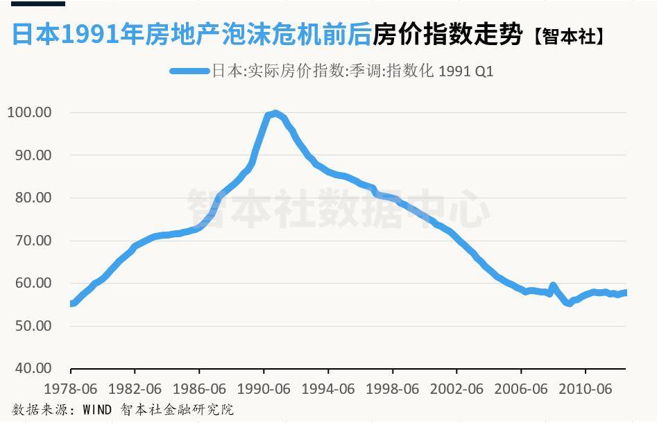 智本社本周统计了三个典型案例,日本1991年房地产泡沫危机、美国2008年次贷危机、中国香港1997年亚洲金融危机前后的房地产走势,定基房价最高点为100,与中国2021年以来的房价走势做对比,以供未来参考。